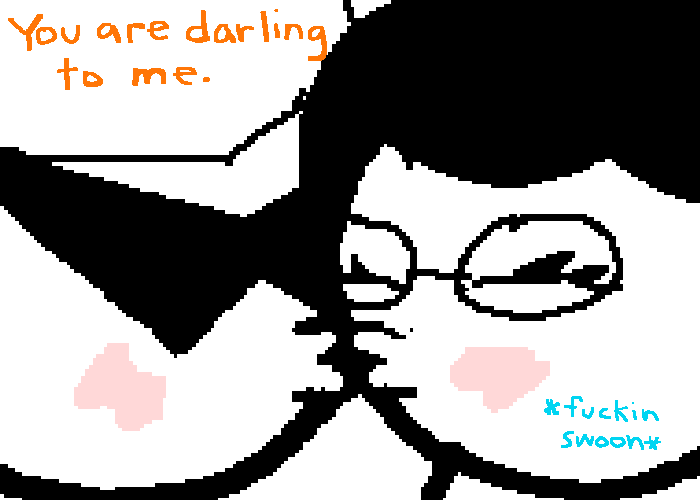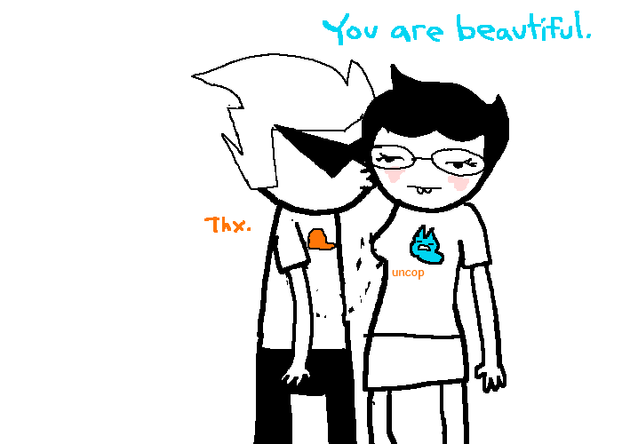 He wants Dirk to play some kind of porn game, despite the fact he's quite busy. The autoresponder eventually convinces him to go back in time and play it then. By porn game is essentially seems to mean "Draw me unspecified pornography or I will execute UU." It takes a bit to determine what he actually wants Dirk to draw though, because his head is so far up his own ass. He finally begins to explain his "commission": No nudity, no sex. Draw the Dirk kissing Jane. Oh, sorry. That wasn't it, get rid of the grope. Make her call you beautiful and tell her you love her. uu is a fucking weird guy man. Jake and Roxy aren't left out of this bizarre fucking sidequest, unfortunately.